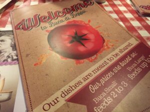 メニューは、基本的にテーブルでシェアして食べるスタイルです。メニューに「Buca Small feeds 2 to 3 / Buca Large feeds up to 5」と書いてあります。Smallサイズで2〜3人、Largeサイズで5人以上ということなのですが、これはアメリカンサイズのお話です!一般的な日本人の私にはSmallサイズは5人前に感じました(笑)。隣のテーブルのLargeサイズを見ましたが、言葉では表せない大きさです!